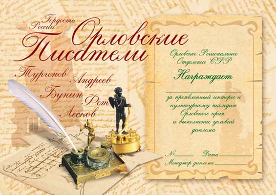 Орел - один из крупнейших центров национальной культуры русского народа. Его литературные традиции берут свои истоки в народном творчестве, которым всегда славился орловский край. Здесь родились И.С.Тургенев и Л.Н.Андреев. В этом городе провели свои детские и юношеские годы Н.С.Лесков и П.И.Якушкин, жили И.А.Бунин, А.Н.Апухтин, М.А.Маркович (Марко Вовчок). В Орле в разное время бывали А.С.Пушкин, В.А.Жуковский, Н.В.Гоголь, Г.И.Успенский, В.Г.Короленко. Писателями-орловцами являются А.А.Фет, Д.И.Писарев, Ф.И.Тютчев, М.М.Пришвин, И.А.Новиков. Страстный патриот родного слова, Н.С.Лесков не преувеличивал, когда говорил, что Орёл "...вспоил на своих мелких водах столько русских литераторов, сколько не поставил их на пользу родины никакой другой русский город..."