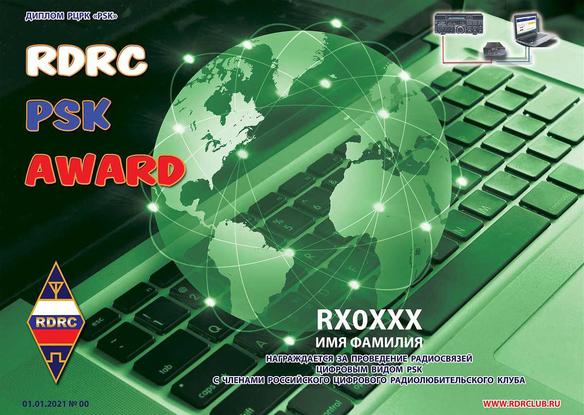RDRC PSK AWARD - один из 16 дипломов, входящих в серию за радиосвязи с членами Российского цифрового радиолюбительского клуба, используя цифровые виды CONTESTIA, DOMINO, FT8, HELL, JT65, JT9, MFSK, MT63, OLIVIA, PSK, ROS, RTTY, SSTV, T10, THOR, THROB. На каждый диплом засчитывается только одна радиосвязь с каждым членом клуба, использующим свой основной позывной, т.е. повторные радиосвязи и радиосвязи с EX и временными позывными не засчитываются. Наблюдателям дипломы выдаются на аналогичных условиях. Зачёт радиосвязей (наблюдений) на дипломы начинается с даты основания Российского цифрового радиолюбительского клуба 21 марта 2014 года.