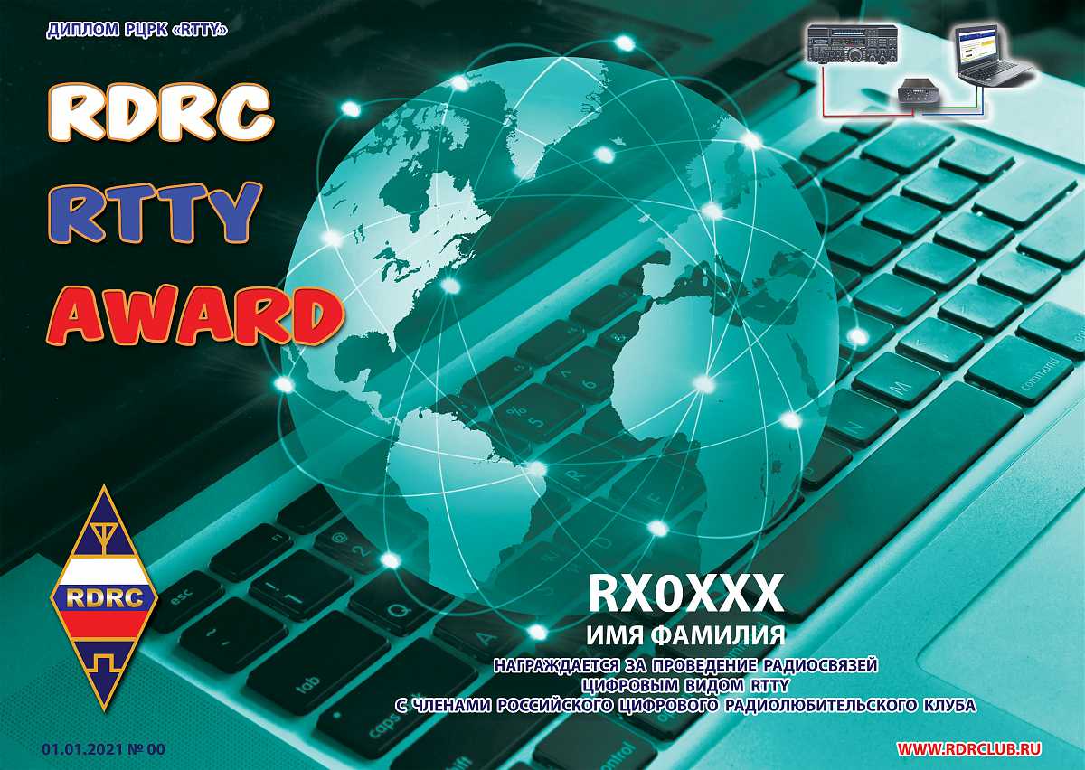 RDRC RTTY AWARD - один из 16 дипломов, входящих в серию за радиосвязи с членами Российского цифрового радиолюбительского клуба, используя цифровые виды CONTESTIA, DOMINO, FT8, HELL, JT65, JT9, MFSK, MT63, OLIVIA, PSK, ROS, RTTY, SSTV, T10, THOR, THROB. На каждый диплом засчитывается только одна радиосвязь с каждым членом клуба, использующим свой основной позывной, т.е. повторные радиосвязи и радиосвязи с EX и временными позывными не засчитываются. Наблюдателям дипломы выдаются на аналогичных условиях. Зачёт радиосвязей (наблюдений) на дипломы начинается с даты основания Российского цифрового радиолюбительского клуба 21 марта 2014 года.