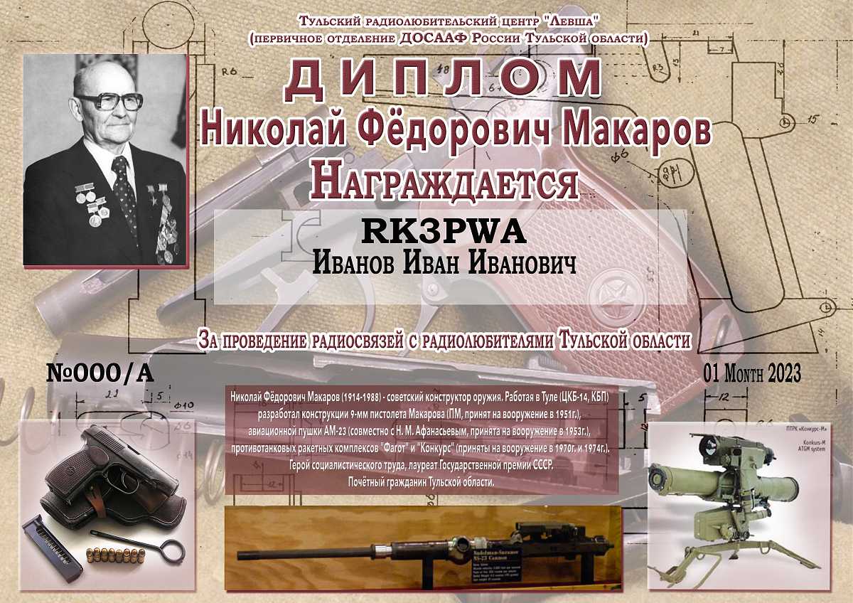 В ознаменование 110-летия со дня рождения выдающегося советского оружейного конструктора Николая Фёдоровича Макарова, Тульский радиолюбительский центр "Левша" (первичное отделение ДОСААФ России Тульской области) учреждает диплом "Николай Федорович Макаров".