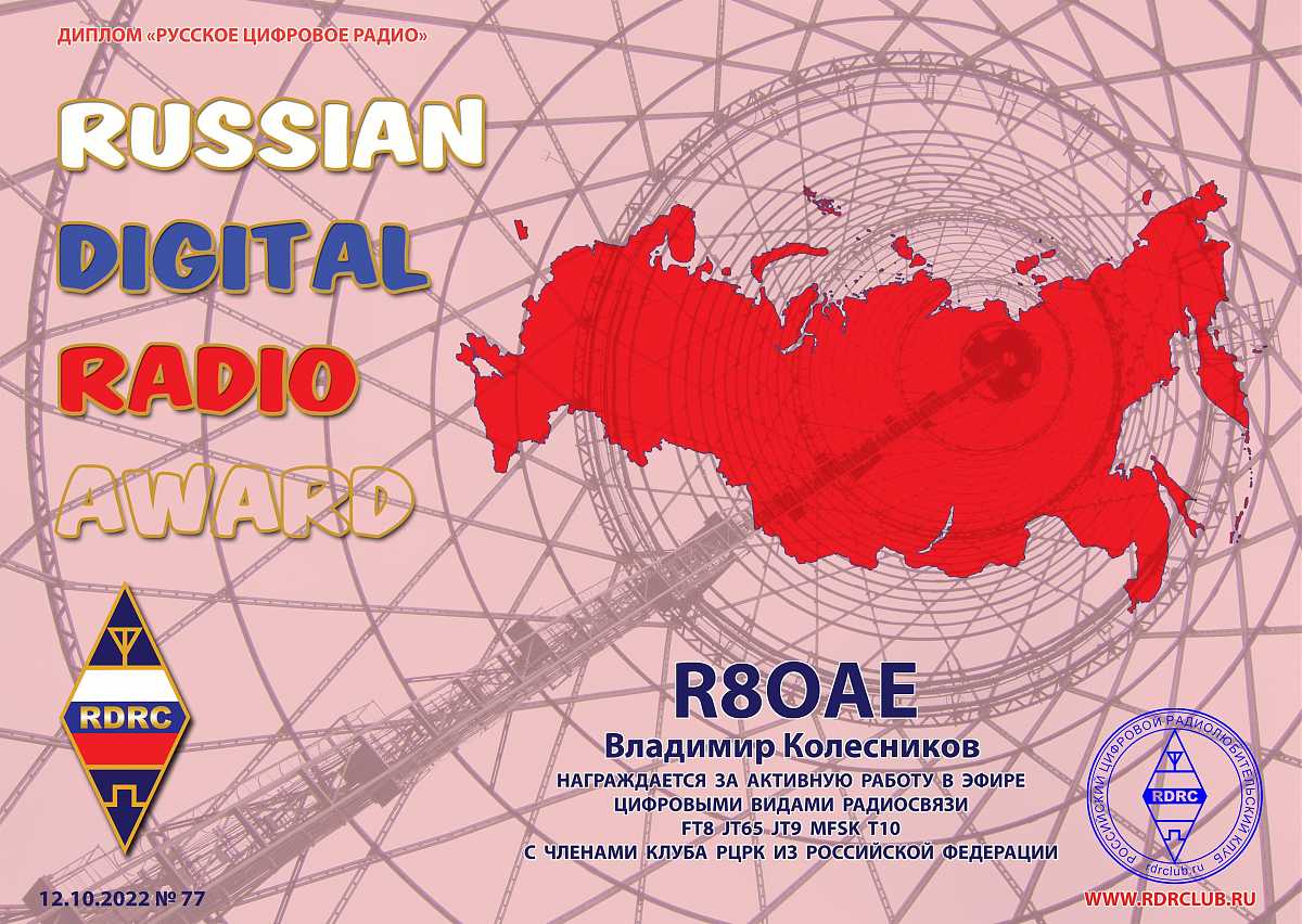 За активную работу в эфире в модах FT8, JT65, JT9, MFSK, T10 с членами РЦРК из Российской Федерации выдаётся диплом из серии "Русское цифровое радио". Необходимо выполнить следующие условия: для соискателей из Европы - 2000 QSO, из Азии - 1000 QSO, для соискателей других континентов мира - 500 QSO. Повторные радиосвязи засчитываются на различных КВ и УКВ диапазонах и разными цифровыми видами на одном диапазоне. Наблюдателям диплом выдаётся на аналогичных условиях.