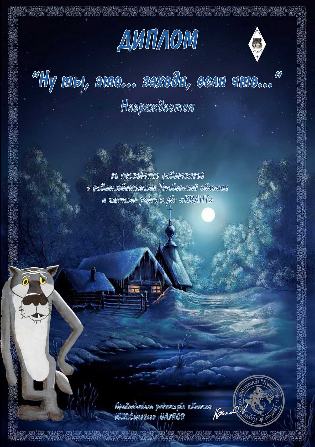 Диплом создан для популяризации радиоклуба «Квант» (Тамбовский волк) и повышения активности работы радиолюбителей в эфире.