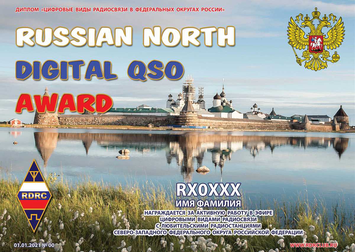 Диплом входит в серию «Цифровые виды радиосвязи в федеральных округах России» - Federal Districts Digital QSO awards и выдаётся за активную работу в эфире с любительскими радиостанциями Северо-Западного федерального округа Российской Федерации, используя цифровые виды связи из 16-ти возможных CONTESTIA, DOMINO, FT8, HELL, JT65, JT9, MFSK, MT63, OLIVIA, PSK, ROS, RTTY, SSTV, T10, THOR, THROB. Повторные радиосвязи засчитываются на различных КВ и УКВ диапазонах и разными цифровыми видами на одном диапазоне. Наблюдателям диплом выдаётся на аналогичных условиях. Зачёт радиосвязей (наблюдений) начинается с даты основания Российского цифрового радиолюбительского клуба 21 марта 2014 года.