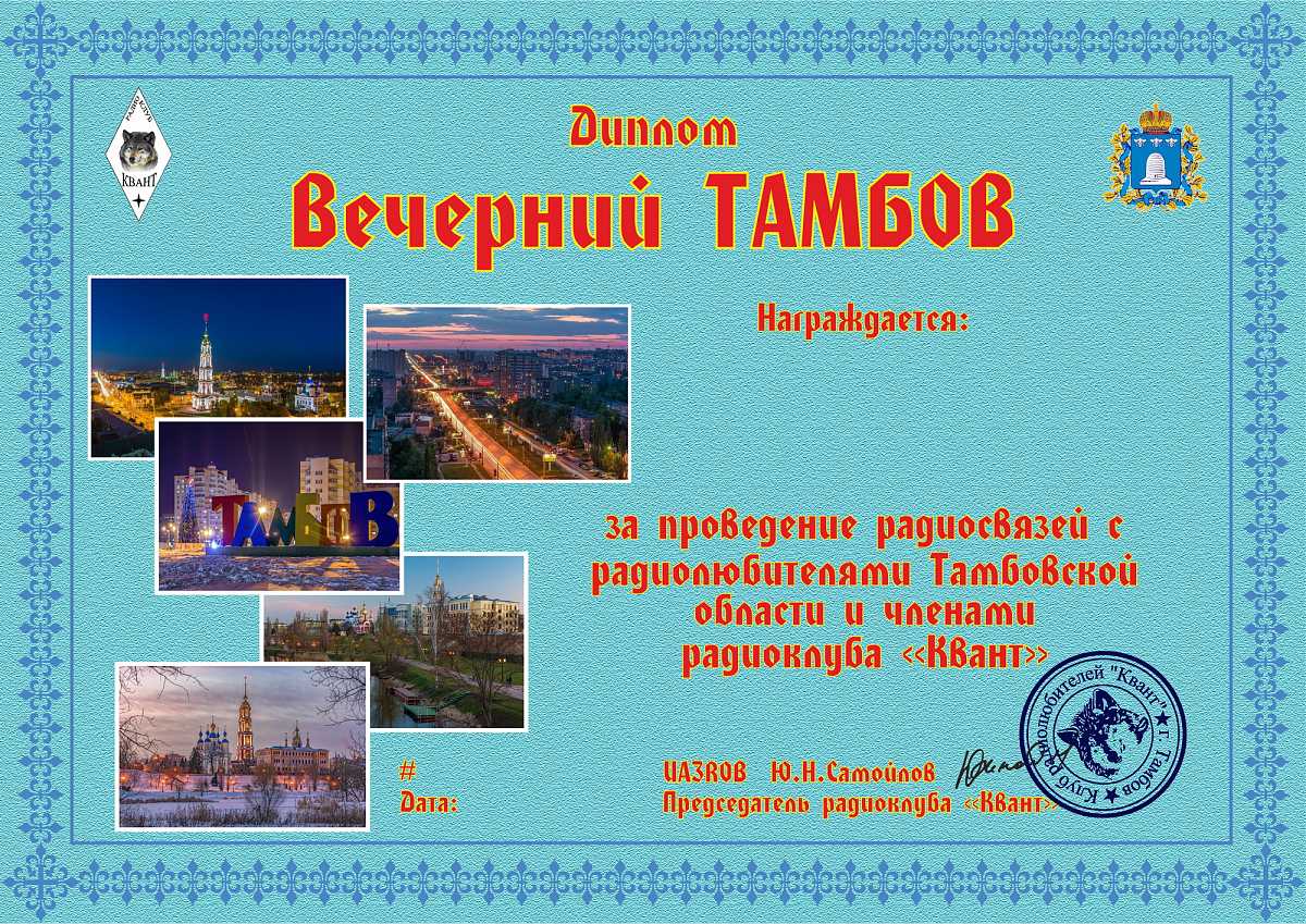 Для получения диплома необходимо набрать 50 очков за радиосвязи с радиостанциями Тамбовской области и членами клуба «Квант».