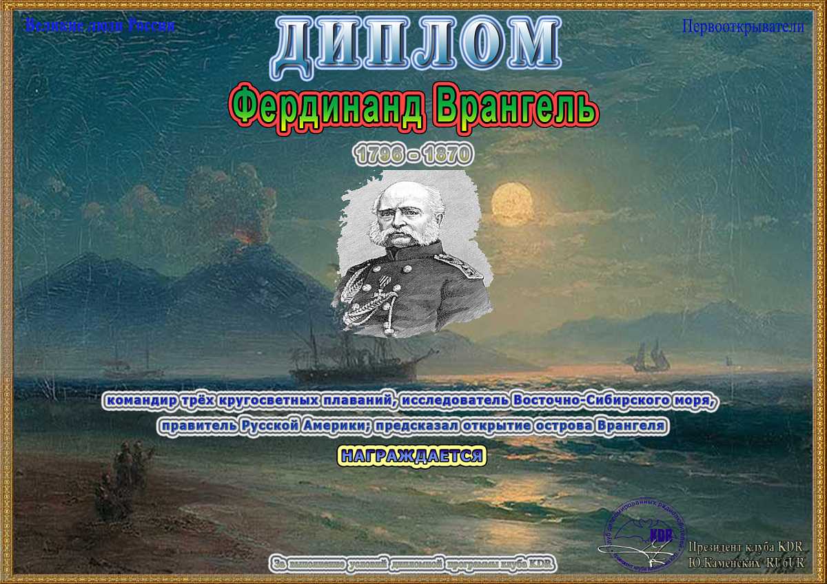 В рамках дипломной программы «Великие люди России – Историческое наследие», часть IV «Первооткрыватели» вашему вниманию предоставляется диплом «Фердинанд Врангель», для получения которого необходимо набрать 1000 очков. Связи на диплом засчитываются с 5 июля 2023 года, диплом бессрочный.