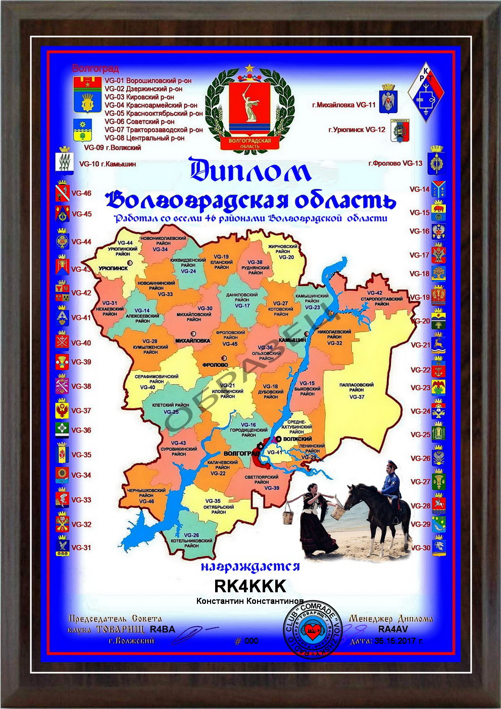 To obtain diplomas, it is necessary to conduct radio communications with radio stations working from different areas of the Volgograd region. (Total 46 districts)