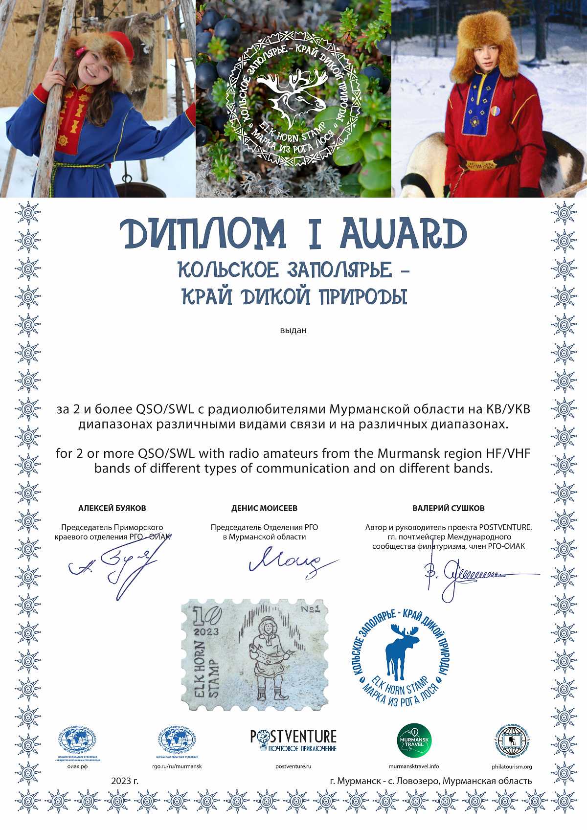 Радиолюбительская награда ELK HORN STAMP PLAQUE «Кольское заполярье – край дикой природы» выполнена на основе первой в мире марки-виньетки из рога лося (ELK HORN STAMP) и выдается для радиолюбителей из разных континентов мира за проведение 3 (трех) и более QSO/SWL с радиолюбителями Мурманской области без ограничений по времени работающих на различных диапазонах и различными видами излучения на платной основе через систему автозачета https://hamlog.online/club/seafarer/895/ путем бронирования номера награды или через дипломную службу напрямую.