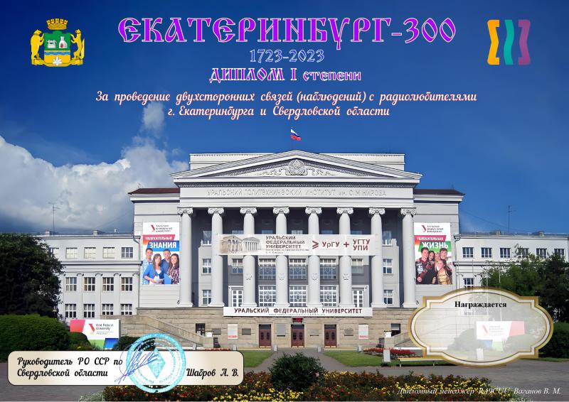 РО СРР по Свердловской области в лице радиолюбителей города Екатеринбурга и области, в связи с 300-летием города также внесёт свой вклад в празднование Юбилея города Екатеринбурга организацией дипломной программы – «300 лет Екатеринбургу».