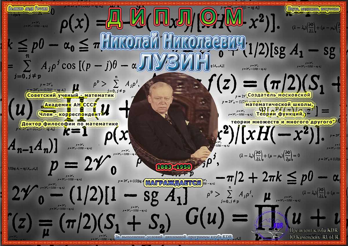 В рамках дипломной программы «Великие люди России – Историческое наследие» вашему вниманию предоставляется диплом «Николай Николаевич Лузин», для получения которого необходимо набрать 1000 очков. Связи на диплом засчитываются с 03 ноября 2021 года, диплом бессрочный.