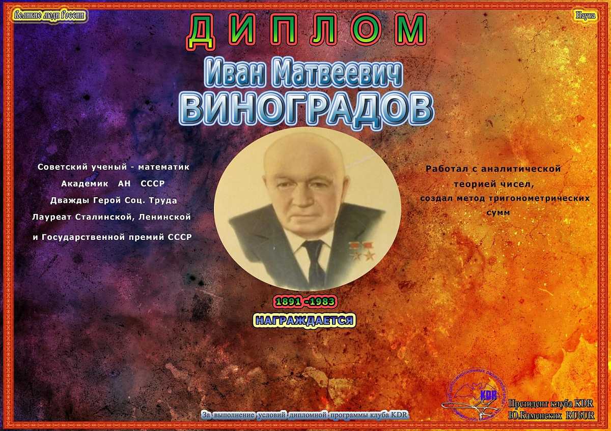 В рамках дипломной программы «Великие люди России – Историческое наследие» вашему вниманию предоставляется диплом «Иван Матвеевич Виноградов», для получения которого необходимо набрать 1000 очков. Связи на диплом засчитываются с 10 ноября 2021 года, диплом бессрочный.