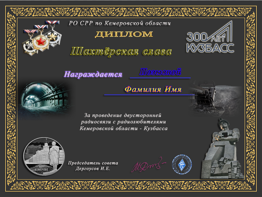 Диплом «Шахтёрская слава» учреждён региональным отделением Союза радиолюбителей России по Кемеровской области.