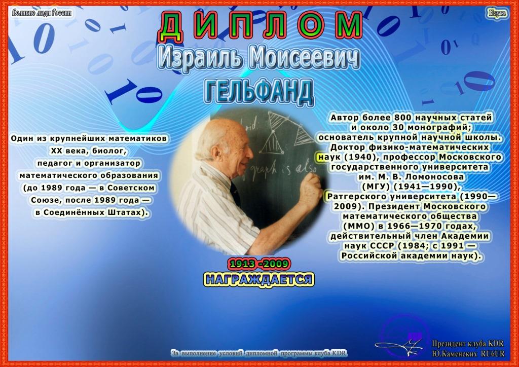 В рамках дипломной программы «Великие люди России – Историческое наследие» вашему вниманию предоставляется диплом «Израиль Моисеевич Гельфанд», для получения которого необходимо набрать 1000 очков. Связи на диплом засчитываются с 15 декабря 2021 года, диплом бессрочный.