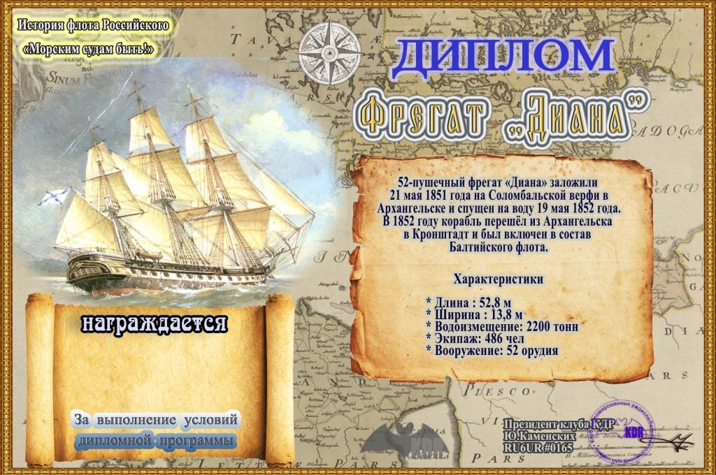 В рамках дипломной программы Клуба Дипломированных радиолюбителей - «История флота Российского» вашему вниманию предоставляется диплом «Фрегат “Диана”».