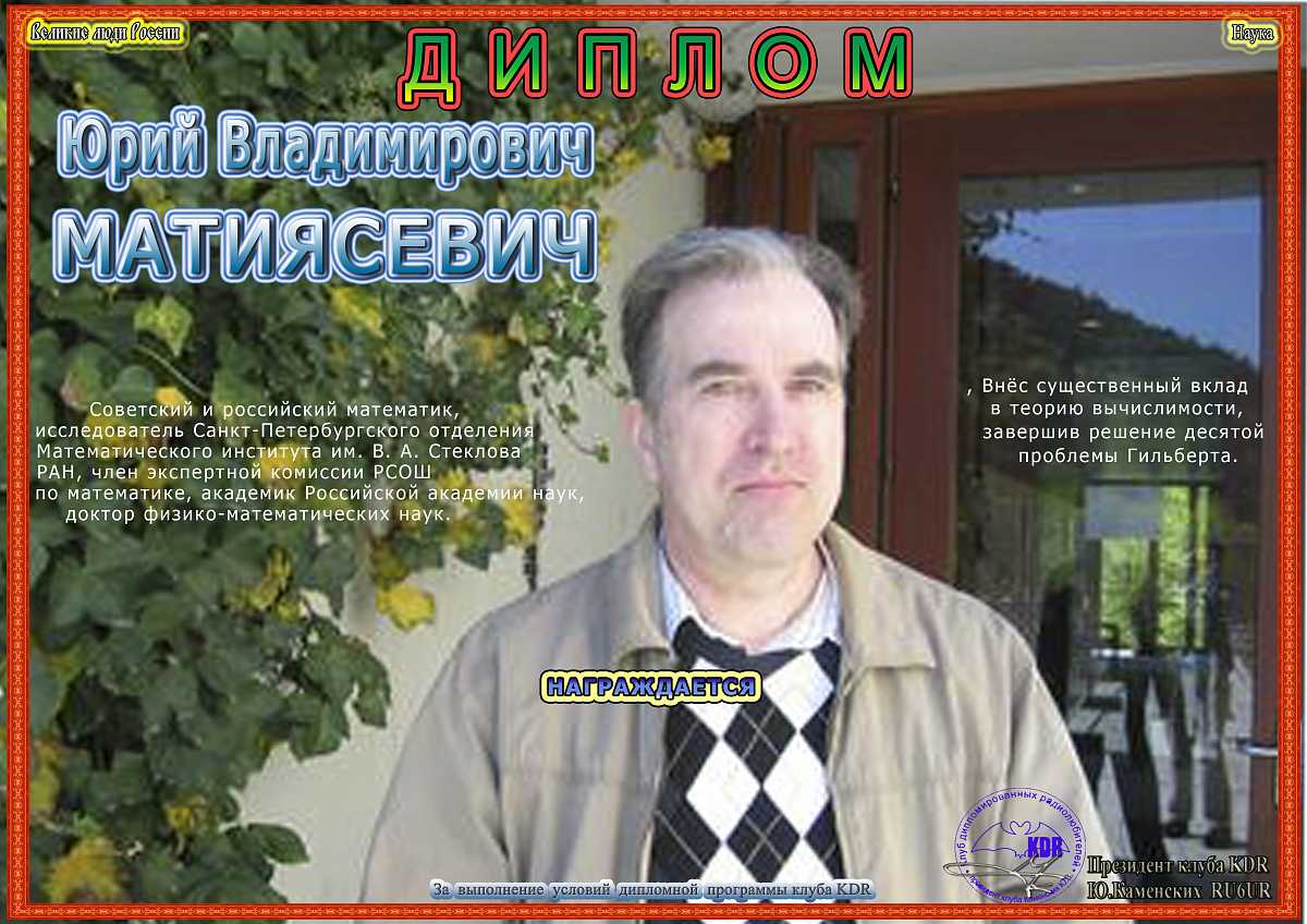 В рамках дипломной программы «Великие люди России – Историческое наследие» вашему вниманию предоставляется диплом «Юрий Владимирович Матиясевич», для получения которого необходимо набрать 1000 очков. Связи на диплом засчитываются с 29 декабря 2021 года, диплом бессрочный.