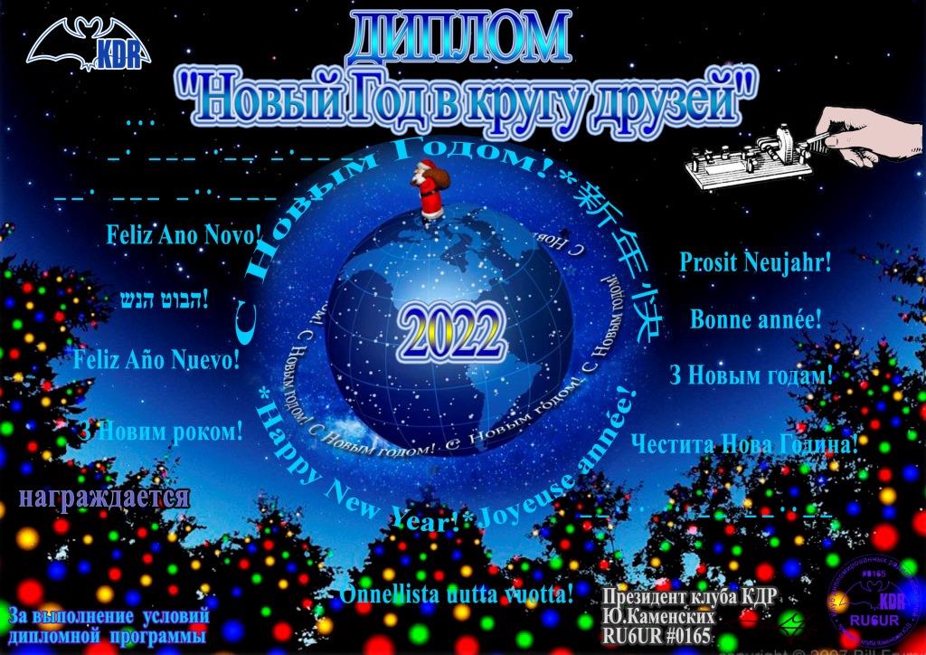 В преддверии празднования Нового 2022 Года Советом Клуба Дипломированных радиолюбителей (KDR) учрежден диплом «Новый Год в кругу друзей», для выполнения условий которого необходимо в период с 31 декабря 2021 года по 8 января 2022 года набрать 2022 очка.