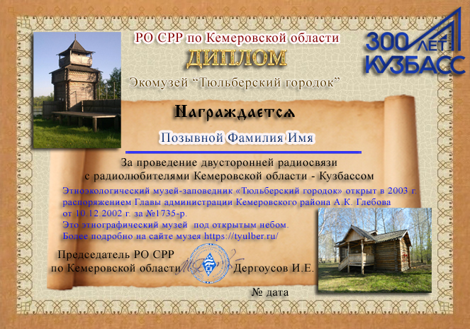 Диплом выдается радиолюбителям Российской федерации и странам ближнего зарубежья. Для его получения необходимо набрать 300 очков за радиосвязи, проведенные с радиолюбителями города Кемерово и Кемеровской области - Кузбассом.
