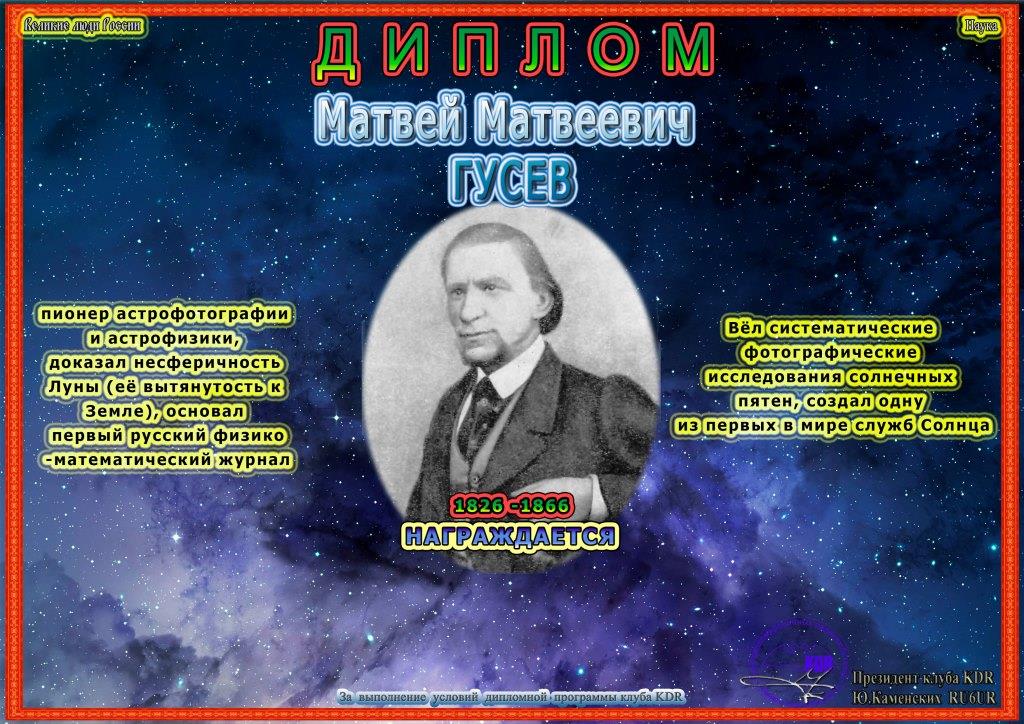В рамках дипломной программы «Великие люди России – Историческое наследие», часть II «Ученые России. Астрономы и астрофизики» вашему вниманию предоставляется диплом «Матвей Матвеевич Гусев», для получения которого необходимо набрать 1000 очков. Связи на диплом засчитываются с 19 января 2022 года, диплом бессрочный.
