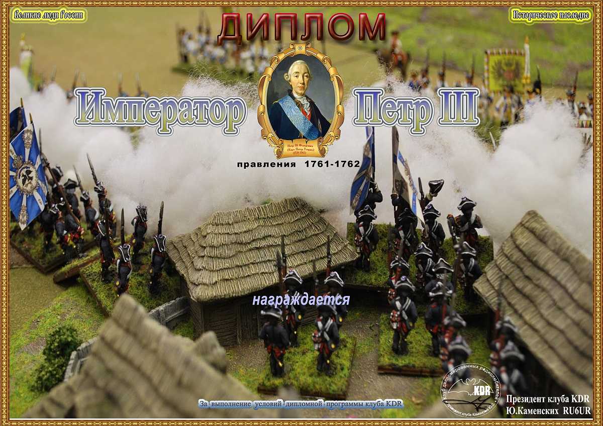 В рамках дипломной программы Клуба дипломированных радиолюбителей «Великие люди России - Историческое наследие» (первая часть программы «От Рюрика до Николая II») вашему вниманию предоставляется диплом «Император Петр III», для получения которого необходимо набрать 1000 очков. Связи на диплом засчитываются с 14 апреля 2021 года, диплом бессрочный.