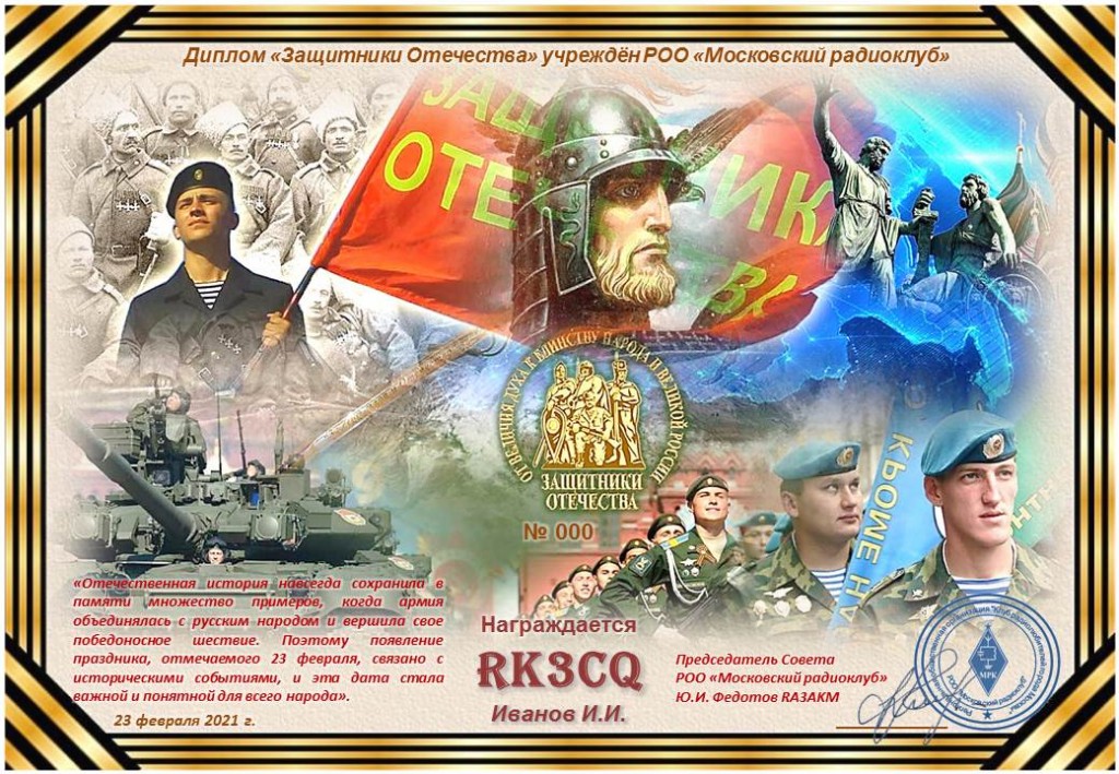 Московские радиолюбители и члены РОО «Московский радиоклуб», независимо от их места проживания, которые в эти дни проведут 50 и более QSO, получат памятный диплом «Защитники Отечества» на основании отчёта о работе в Днях активности.