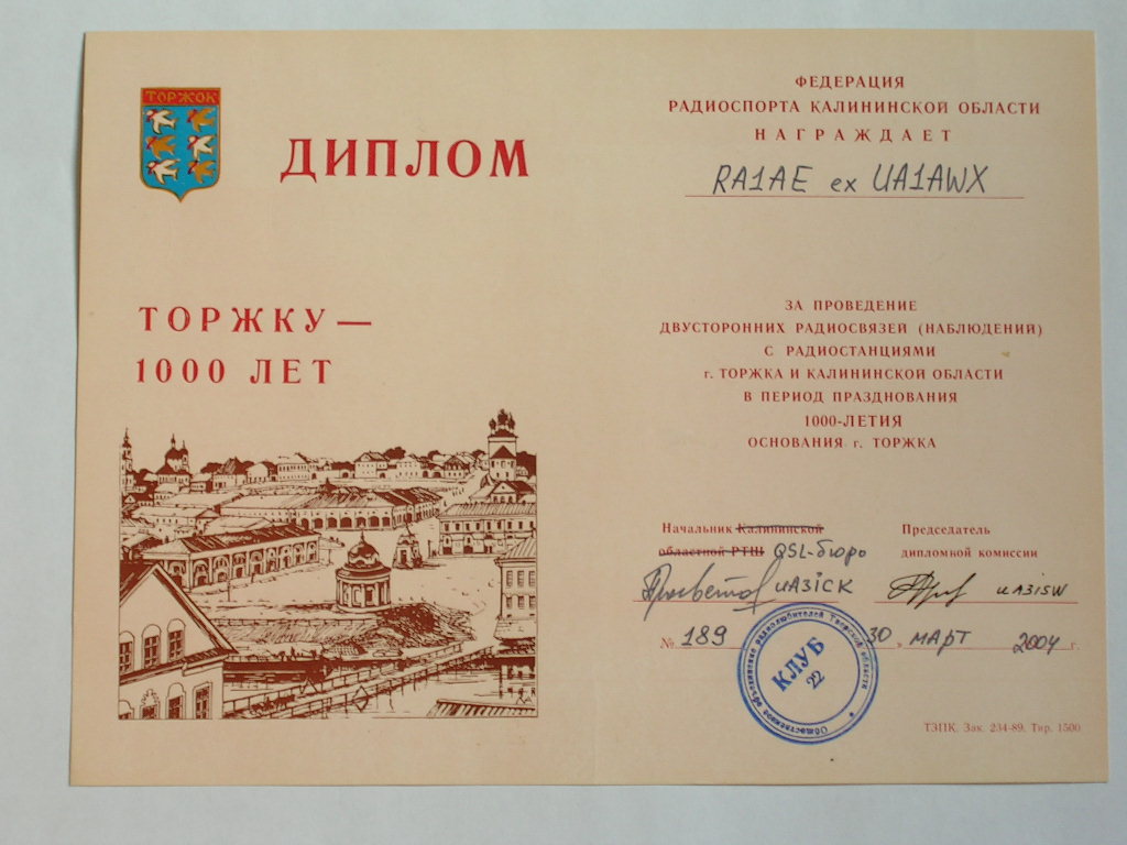 Для получения диплома необходимо набрать 1000 очков за QSO с Тверской областью.