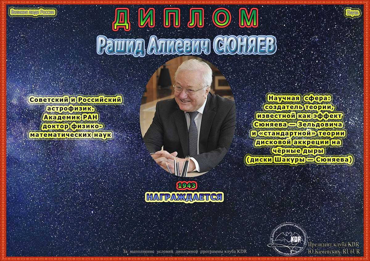 В рамках дипломной программы «Великие люди России – Историческое наследие», часть II «Ученые России. Астрономы и астрофизики» вашему вниманию предоставляется диплом «Рашид Алиевич Сюняев», для получения которого необходимо набрать 1000 очков. Связи на диплом засчитываются с 30 марта 2022 года, диплом бессрочный.