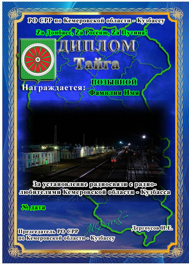 Диплом «Тайга» учреждён региональным отделением Союза радиолюбителей России по Кемеровской области – Кузбассу в рамках дипломной программы «Огни вечерних городов Кузбасса».