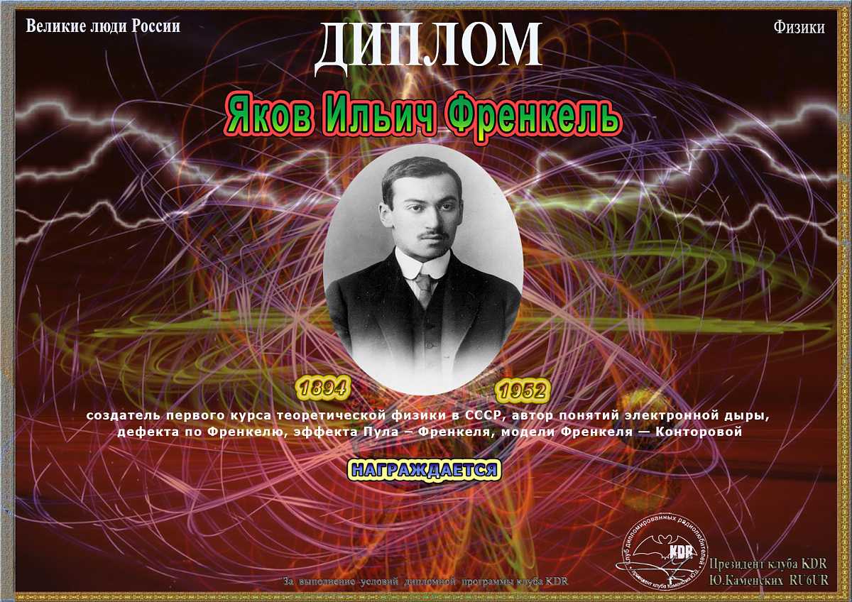 В рамках дипломной программы «Великие люди России – Историческое наследие», часть II «Ученые России. Физики» вашему вниманию предоставляется диплом «Яков Ильич Френкель», для получения которого необходимо набрать 1000 очков. Связи на диплом засчитываются с 18 мая 2022 года, диплом бессрочный.