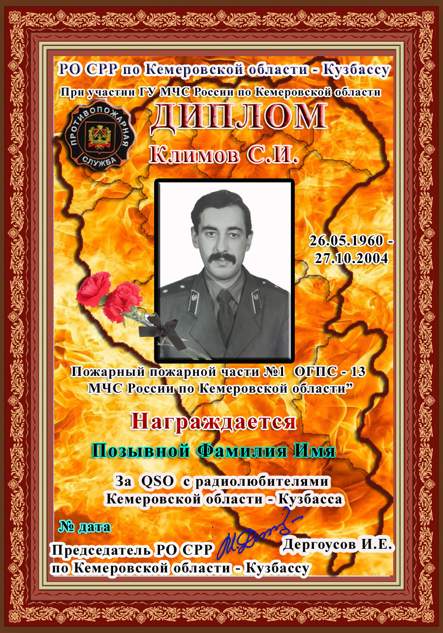 Диплом «Климов С.И.» учреждён региональным отделением Союза радиолюбителей России по Кемеровской области – Кузбасса при участии ГУ МЧС России по Кемеровской области - Кузбассу. Входит в дипломную программу «Огнеборцы Кузбасса», серия «Книга памяти».