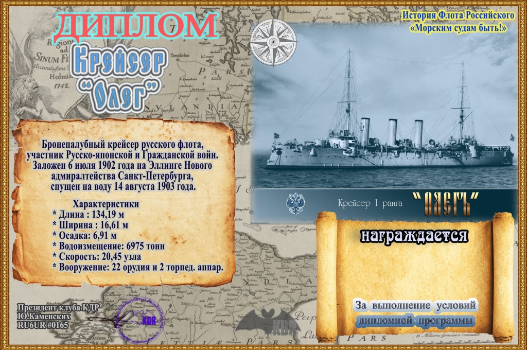 В рамках дипломной программы Клуба Дипломированных радиолюбителей - «История флота Российского» вашему вниманию предоставляется диплом «Крейсер Олег».