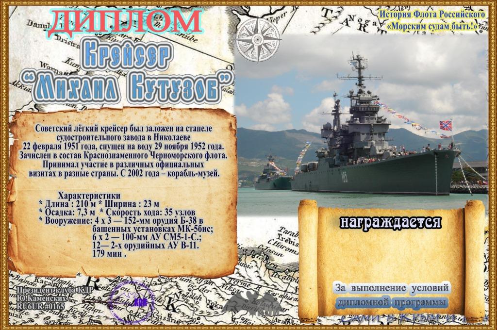 В рамках дипломной программы Клуба Дипломированных радиолюбителей - «История флота Российского» вашему вниманию предоставляется диплом «Крейсер Михаил Кутузов».