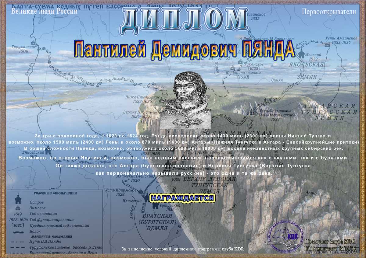 В рамках дипломной программы «Великие люди России – Историческое наследие», часть IV «Первооткрыватели» вашему вниманию предоставляется диплом «Пантелей Демидович Пянда», для получения которого необходимо набрать 1000 очков. Связи на диплом засчитываются с 7 декабря 2022 года, диплом бессрочный.