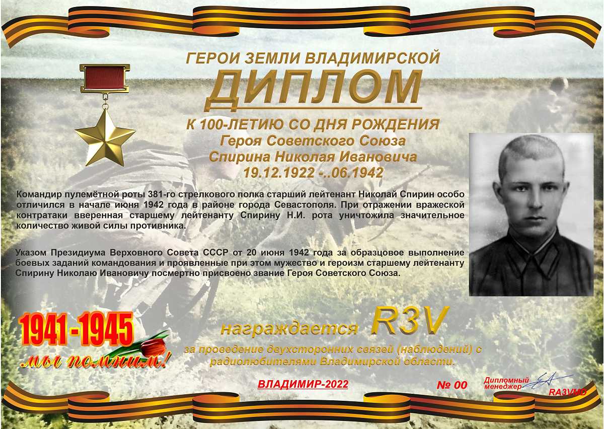 Диплом учрежден Владимирским областным радиоклубом и посвящен 100-летию со дня рождения Героя Советского Союза Николая Ивановича Спирина, командира пулемётной роты 381-го стрелкового полка 109-й стрелковой дивизии Приморской армии Северо-Кавказского фронта, старшего лейтенанта.