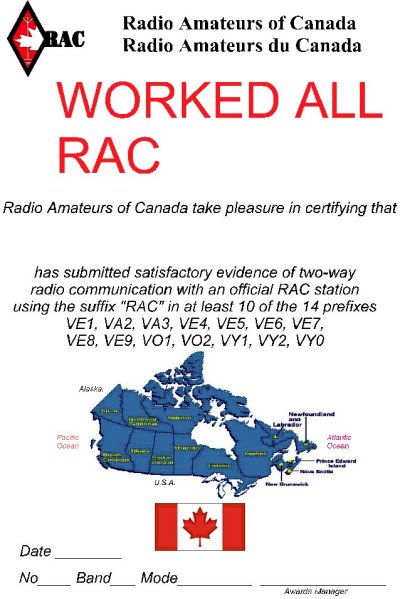 Выдается за подтвержденные двухсторонние радиосвязи с официальными станциями RAC (Radio Amateurs of Canada), использующими суффикс "RAC", с как минимум 10 из 18 префиксов.