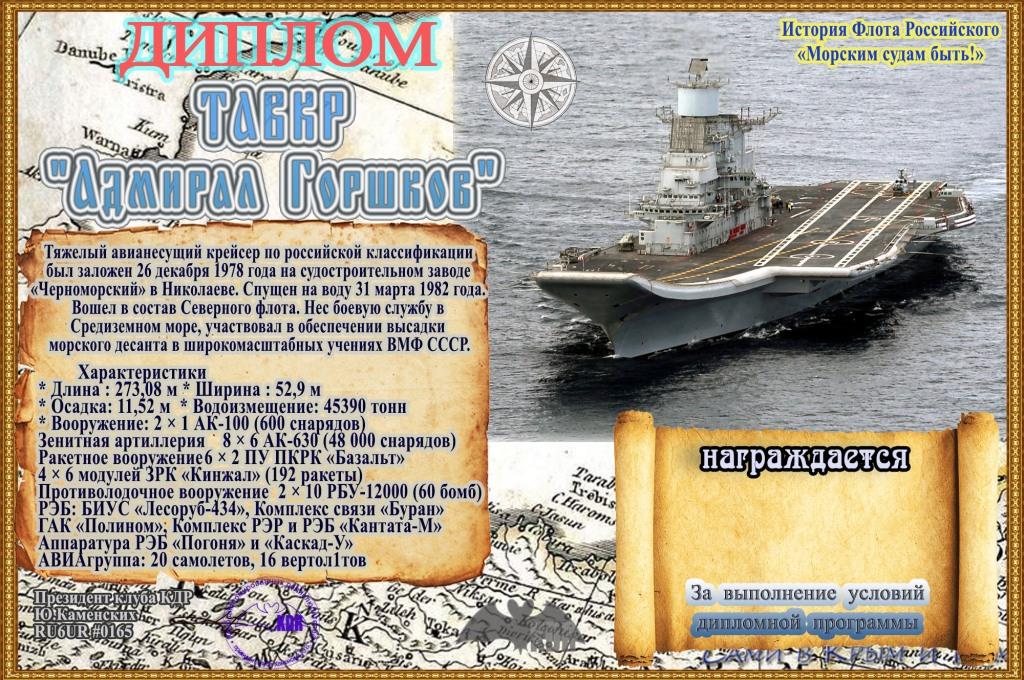 В рамках дипломной программы Клуба Дипломированных радиолюбителей - «История флота Российского» вашему вниманию предоставляется диплом «ТАВКР Адмирал Советского Союза Горшков».