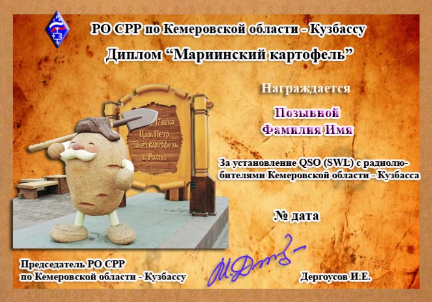 Диплом «Мариинский картофель» учреждён региональным отделением Союза радиолюбителей России по Кемеровской области – Кузбассу.