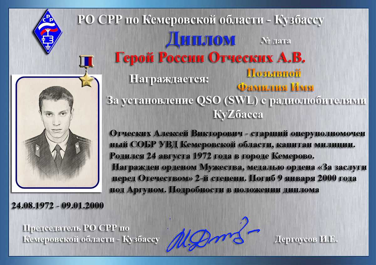 Диплом «Герой России Отческих А.В.» учреждён региональным отделением Союза радиолюбителей России по Кемеровской области – Кузбасса при информационной поддержке Вячеслава Старцева (Музейный волонтёр, ветеран ГСВСК (Группа Советских Военных Специалистов на Кубе). Входит в дипломную программу «Герои России - гордость Кузбасса».