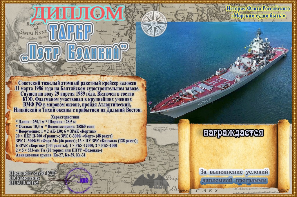В рамках дипломной программы Клуба Дипломированных радиолюбителей - «История флота Российского» вашему вниманию предоставляется диплом «ТАРКР Петр Великий».