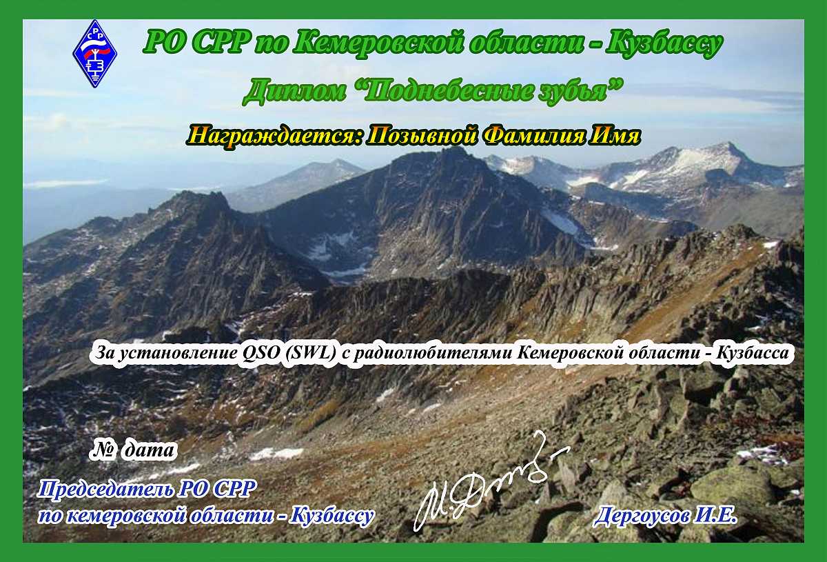 Диплом «Поднебесные зубья» учреждён региональным отделением Союза радиолюбителей России по Кемеровской области – Кузбассу. Входит в дипломную программу «Достопримечательности Кузбасса»