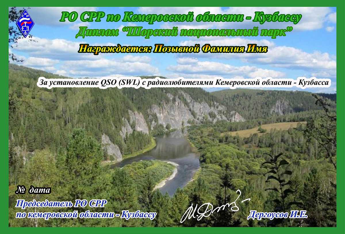 Диплом «Шорский национальный парк» учреждён региональным отделением Союза радиолюбителей России по Кемеровской области – Кузбассу. Входит в дипломную программу «Достопримечательности Кузбасса»