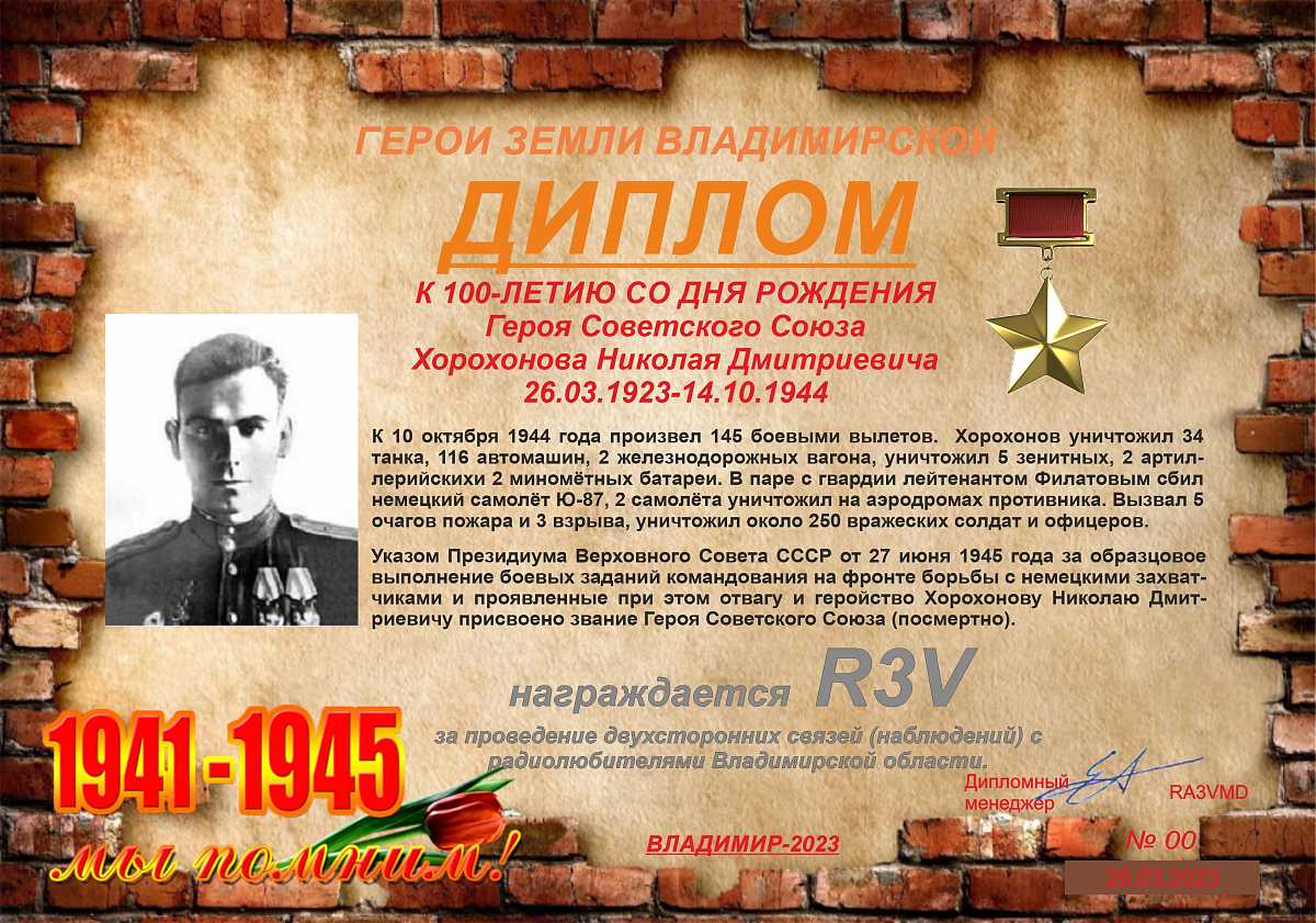 Диплом учрежден Владимирским областным радиоклубом и посвящен 100-летию со дня рождения Героя Советского Союза Хорохонова Николая Дмитриевича – командира звена 143-го гвардейского штурмового авиационного Львовского полка (8-я гвардейская штурмовая авиационная Полтавская Краснознамённая ордена Богдана Хмельницкого дивизия, 1-й гвардейский штурмовой авиационный Кировоградский Краснознамённый ордена Суворова корпус, 2-я воздушная армия, 1-й Украинский фронт), гвардии младшего лейтенанта.