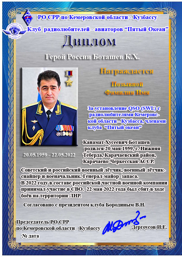 Диплом «Герой России Боташев К.Х.» учреждён региональным отделением Союза радиолюбителей России по Кемеровской области – Кузбассу при участии клуба радиолюбителей – авиаторов «Пятый Океан».