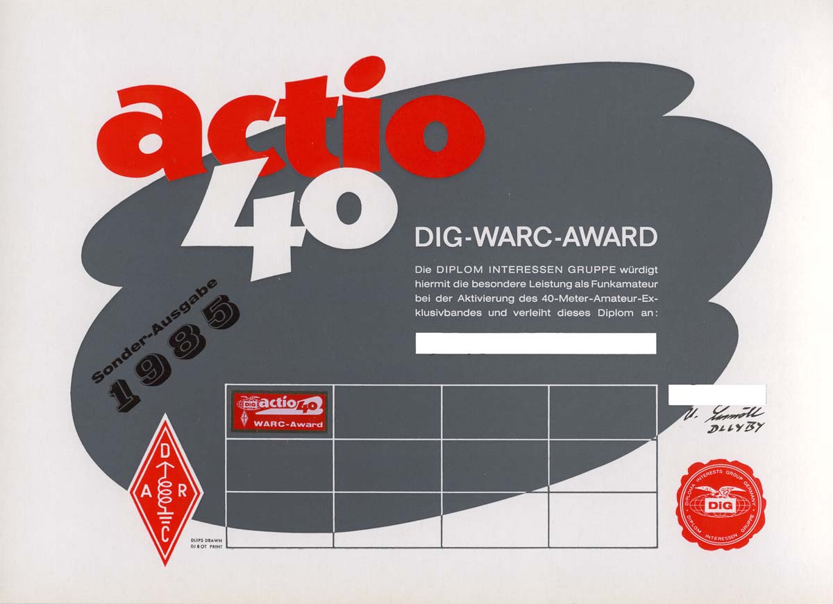 Das Diplom wurde im Mдrz 2007 wieder neu ins Leben gerufen und kann von Funkamateuren und entsprechend von SWLs (das ist neu) mit einem Logbuchauszug beantragt werden. Fьr Antrдge zur DIG-Trophy 1000 ist das actio 40 seit 1. Januar 1995 mit allen mцglichen Stickern im Antrag aufzufьhren.