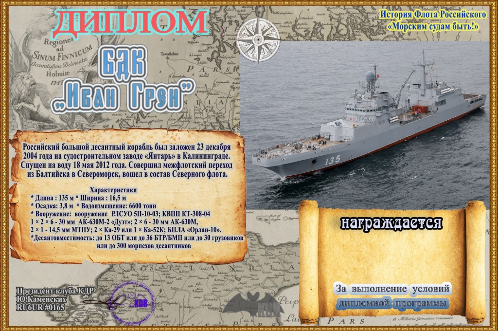 В рамках дипломной программы Клуба Дипломированных радиолюбителей - «История флота Российского» вашему вниманию предоставляется диплом «БДК Иван Грен».