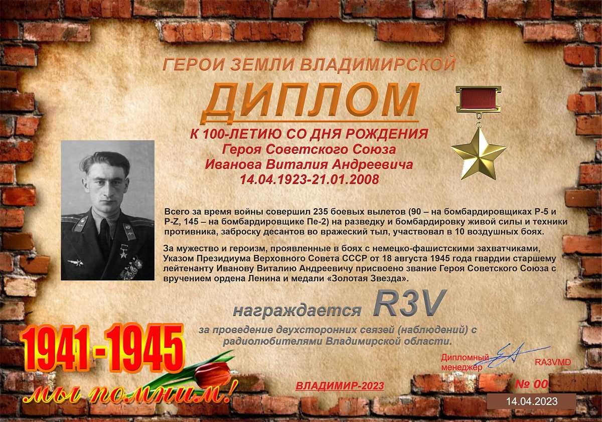 Диплом учрежден Владимирским областным радиоклубом и посвящен 100-летию со дня рождения Героя Советского Союза Иванова Виталия Андреевича – командира звена 4-го гвардейского бомбардировочного авиационного полка (188-я бомбардировочная авиационная дивизия, 15-я воздушная армия, 2-й Прибалтийский фронт), гвардии старшего лейтенанта.