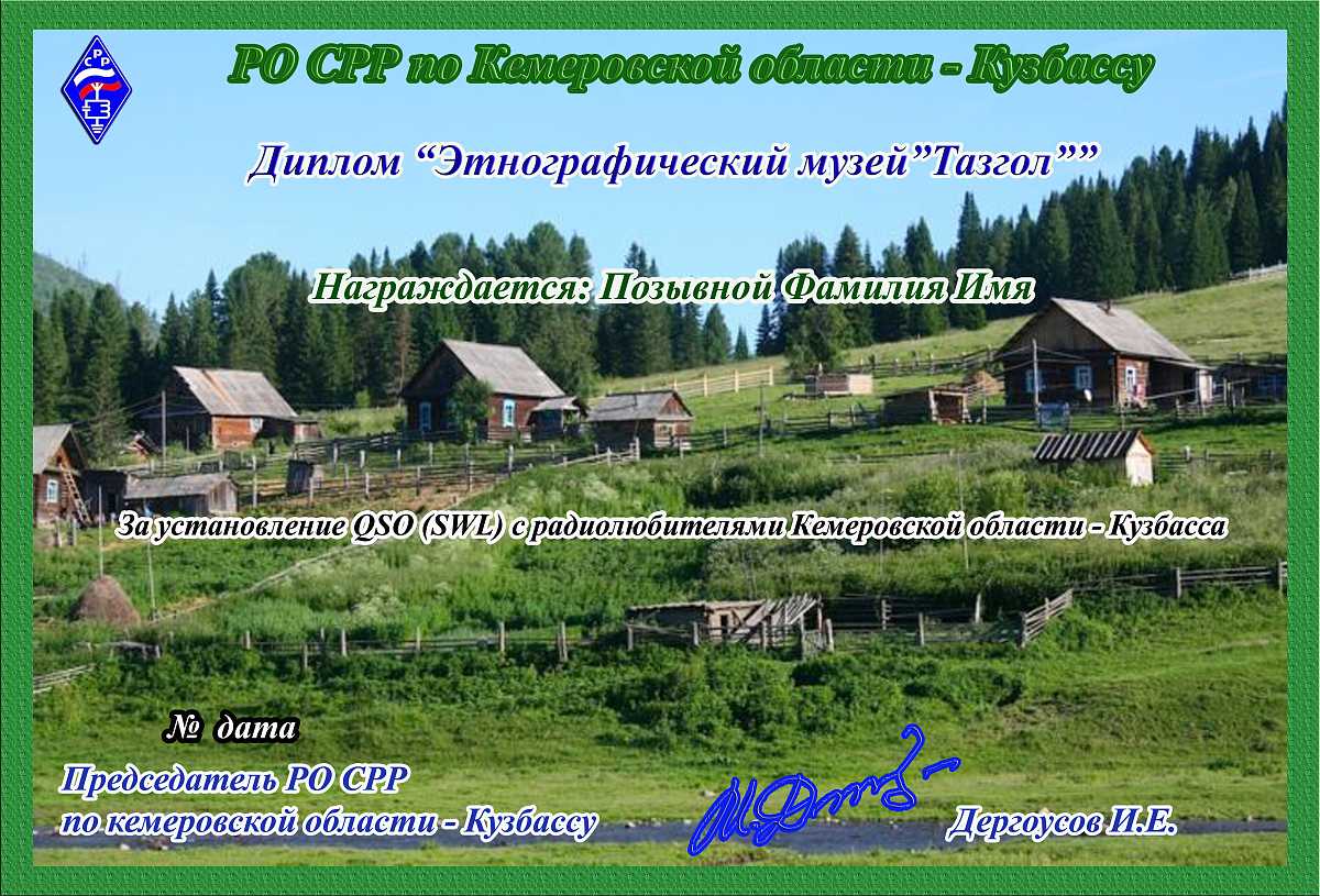Диплом «Этнографический музей «Тазгол»» учреждён региональным отделением Союза радиолюбителей России по Кемеровской области – Кузбассу. Входит в дипломную программу «Достопримечательности Кузбасса»