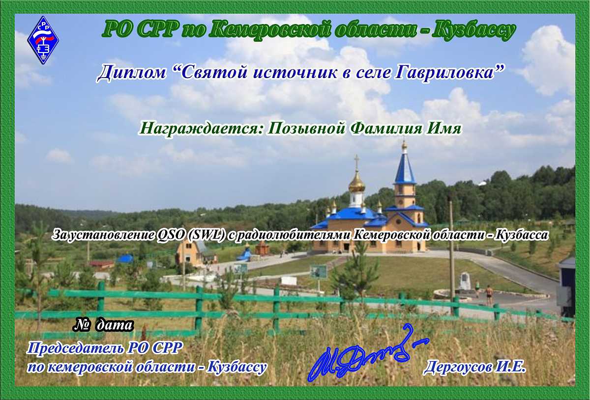 Диплом «Святой источник в селе Гавриловка» учреждён региональным отделением Союза радиолюбителей России по Кемеровской области – Кузбассу. Входит в дипломную программу «Достопримечательности Кузбасса»
