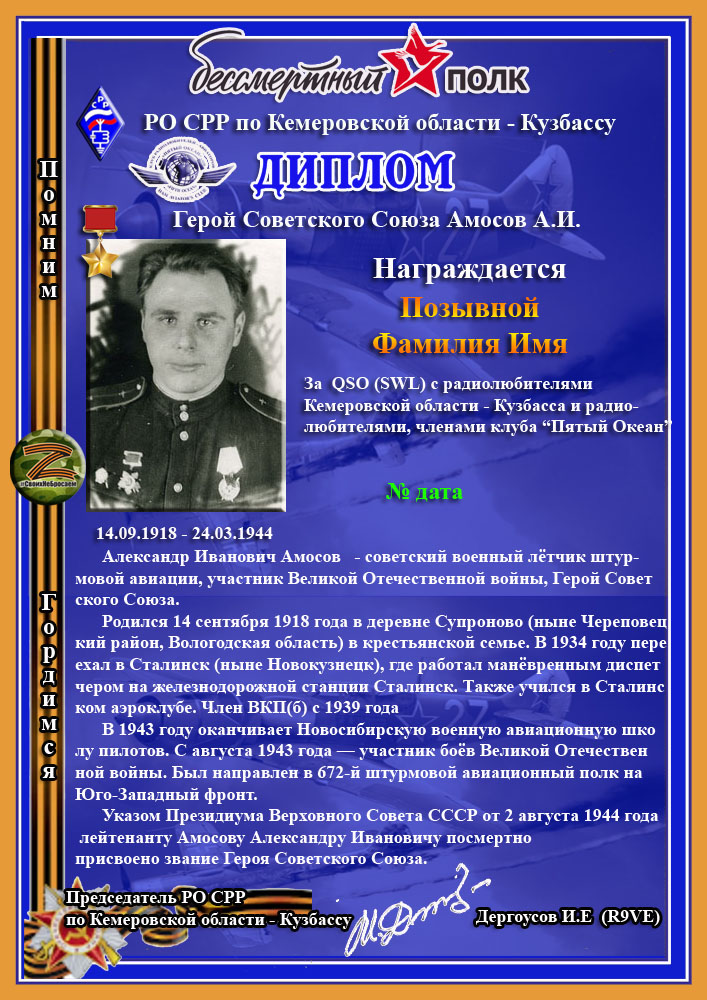 Диплом «Герой Советского Союза Амосов А.И.» учреждён региональным отделением Союза радиолюбителей России по Кемеровской области – Кузбассу при участии клуба радиолюбителей – авиаторов «Пятый Океан».