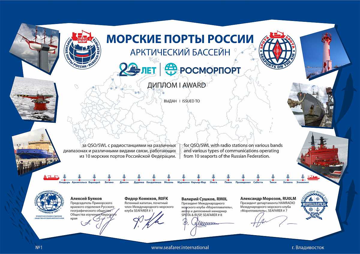 Электронные дипломы 5 степеней в линейке «МОРСКИЕ ПОРТЫ РОССИИ» (RUSP) выдаются радиолюбителям-охотникам, включая радиолюбителям-наблюдателям (SWL) исключительно в электронном виде на бесплатной основе через систему автозачета https://hamlog,online или на основании полученных бумажных QSL (предоставляются ксерокопии) и e-QSL (предоставляются скрин-шоты или копии).