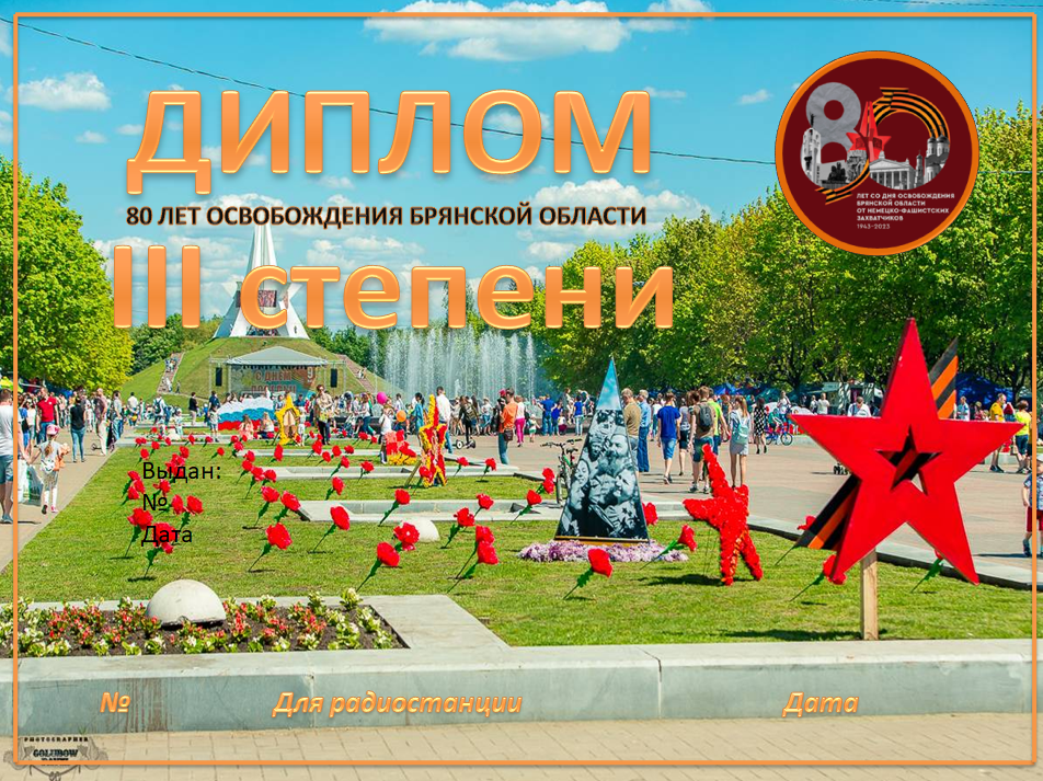 Диплом "80 лет освобождения Брянской области" выдается за проведение в период с 11 сентября по 31 декабря 2023 года за более, чем 100 QSO и имеет 3 степени: