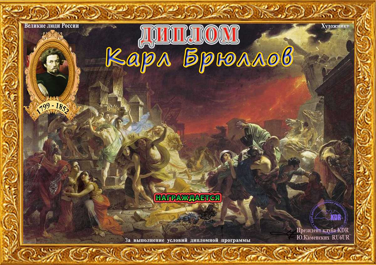В рамках дипломной программы «Великие люди России – Историческое наследие», часть V «Художники» вашему вниманию предоставляется диплом «Карл Брюллов», для получения которого необходимо набрать 1000 очков. Связи на диплом засчитываются с 18 октября 2023 года, диплом бессрочный.